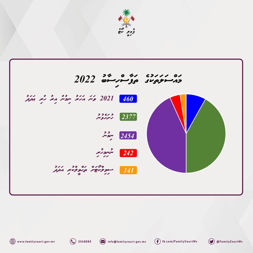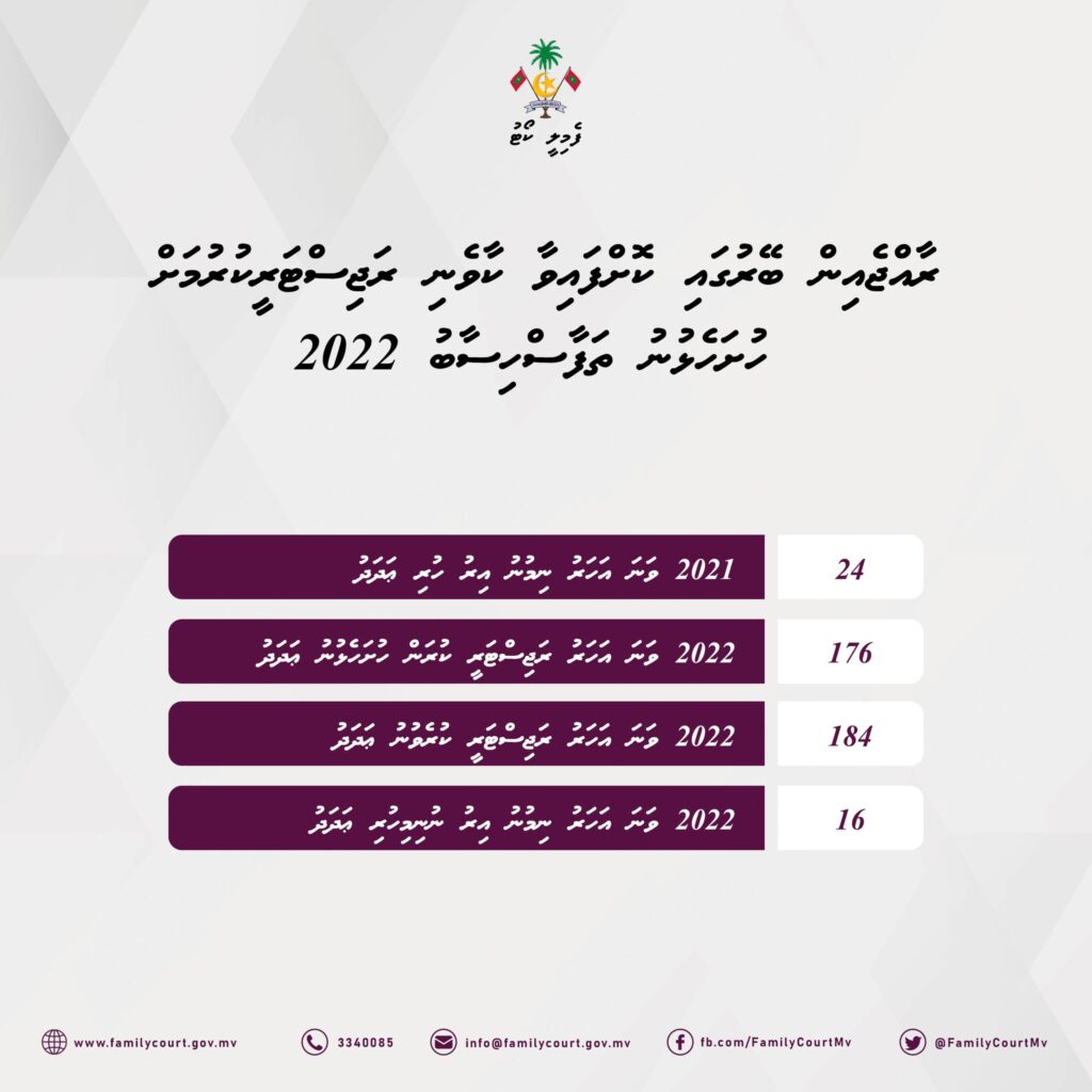 އަދި 2022 ވަނަ އަހަރު ނިމުނު ރާއްޖެއިން ބޭރުގައި ކޮށް ފެމިލީ ކޯޓަށް ރަޖިސްޓްރީ ކުރަން ހުށަހެޅި 16 ކައިވެނީގެ މައްސަލަ އަދި ނުނިމެއެވެ.