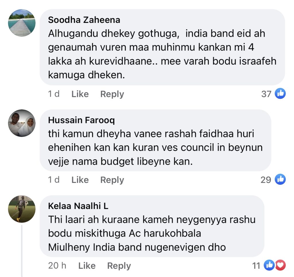 ކެލާ ކައުންސިލްގެ ފޭސްބުކްގައި ޝާއިއުކޮށްފައިވާ މި ޕޯސްޓްޓަށް ގިނަ ބަޔަކު ވަނީ ނުރުހުން ފާޅުކޮށް ކޮމެންޓްތައް ކޮށްފައެވެ. އެގޮތުން މިއުޒިކް ބޭންޑް ގެނެސްގެން ޝޯ ދިނުމަށްވުރެ މުހިންމު ކަންކަން އެ ފައިސާއަށް ކުރެވޭނެ ކަމަށްވެސް ބުނެފައިވެއެވެ.
