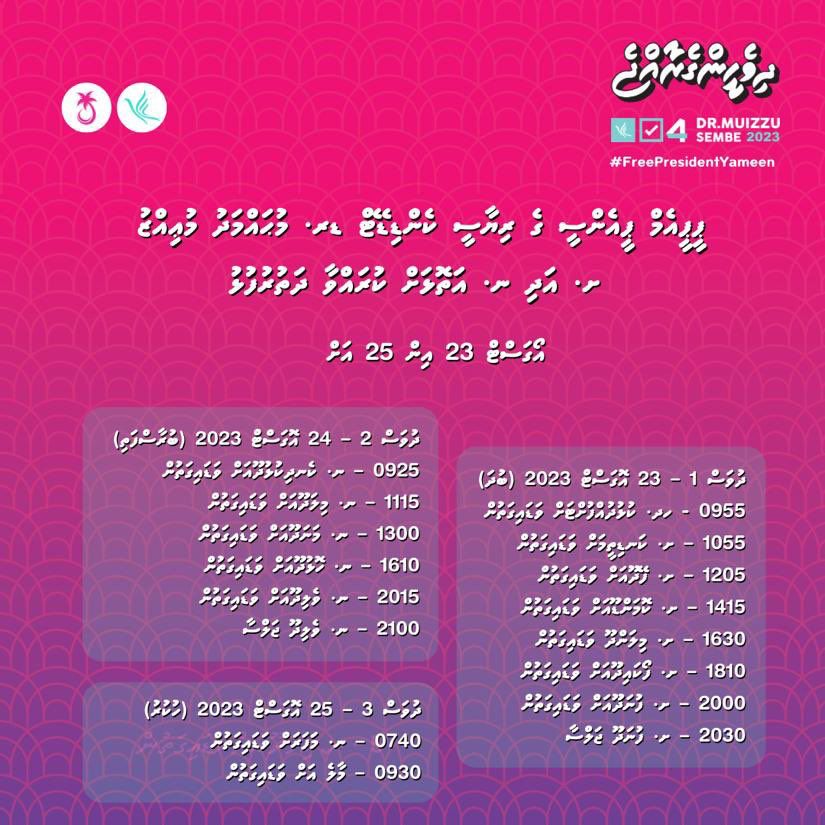 ބުރާސްފަތި ދުވަހު އެންމެ ފުރަތަމަ އިދިކޮޅު ރިޔާސީ ކެންޑިޑޭޓު ވަޑައިގަންނަވާނީ ނ ކެނދިކުޅުދޫއަށެވެ. އެއަށްފަހު މިލަދޫ، މަނަދޫ، ހޮޅުދޫ އަދި ވެލިދޫއަށް ވަޑައިގަންނަވާނެއެވެ.