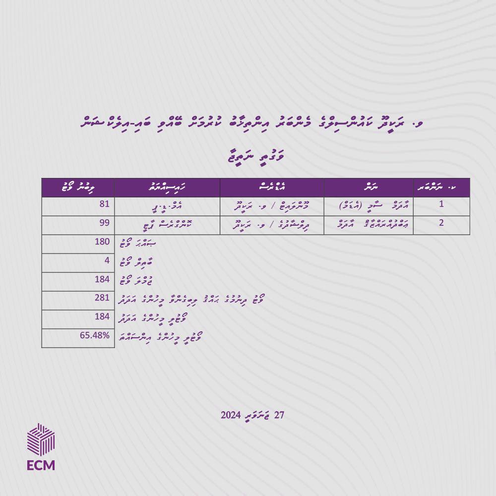 281 މީހަކަށް ވޯޓްލުމުގެ ހައްގު ލިބިފައިވާ މި ބައި އިލެކްޝަންގައި ޕީއެންސީގެ ކެންޑިޑޭޓް އަބްދުއްރައްޒާގަށް 99 ވޯޓް ލިބިވަޑައިގަތެވެ. އެމްޑީޕީގެ ކެނޑިޑޭޓް އާދަމް ސާމީއަށް ލިބިވަޑައިގަތީ 81 ވޯޓެވެ. ބާތިލް ވޯޓުގެ އަދަދަކީ 4 އެވެ. މި އިންތިހާބުގައި 184 މީހަކު ވަނީ ވޯޓްލާފައެވެ. އެއީ ވޯޓް ލުމުގެ ހައްގު ލިބިފައިވާ މީހުންގެ 65.4 އިންސައްތައެެވެ.