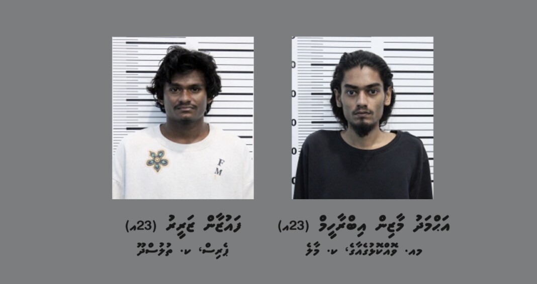 މި މައްސަލައިގެ ތުހުމަތުގައި ހައްޔަރުކޮށްފައިވަނީ ކ.ތުލުސްދޫ ޕެރިސް ފައުޒާން ޒަރީރާއި މއ.ވޮއްކޮޅުގެ އަހްމަދު މާޒިން އިބްރާހީމެވެ. މި ދެމީހުންގެ ބަންދާމެދު ގޮތެއް ނިންމުމަށް މިއަދު ކްރިމިނަލް ކޯޓަށް ހާޒިރުކުރުމުން ޝަރީއަތް ނިމެންދެން ބަންދުކުރުމަށް އަމުރުކޮށްފައިވާ ކަމަށް ފުލުހުން މަޢުލޫމާތުދެއެވެ.