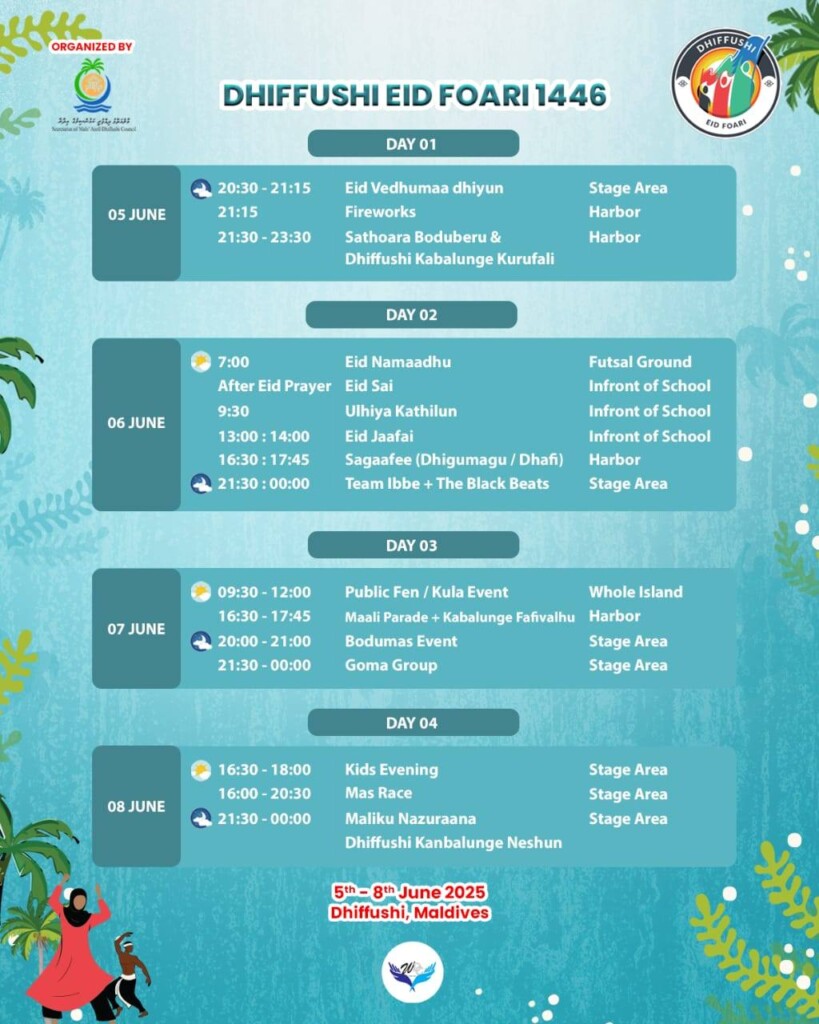 އީދު ފާހަގަކުރުމުގެ ހަރަކާތްތައް ފެށިގެންދަނީ އީދު ވެދުމާއި ހަވާ އެރުވުމާއެކުގައެވެ. މީގެ އިތުރުން ފުރަތަމަ ދުވަހު ސަތޯރާ ބޮޑުބެރު އަދި ދިއްފުށީ ކަނބަލުންގެ ކުރުފަލި ފަދަ ސަގާފީ ހަރަކާތްތައް ބޭއްވުމަށް ވަނީ ހަމަޖެހިފައެވެ. ދެވަނަ ދުވަހު އީދު ނަމާދާއި އީދު ސައި، އުލްހިޔާ ކަތިލުމާއި އީދު ޖާފަތުގެ އިތުރުން ސަގާފީ ހަރަކާތްތަކާއި ސްޓޭޖް ޝޯވއެއް ބޭއްވުމަށް ވަނީ ރޭވިފައެވެ.