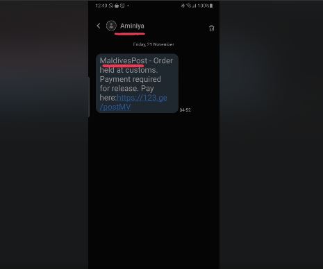 ފުލުހުން ބުނީ “އަމީނިއްޔާ”ގެ ނަމުގައި ކަސްޓަމްސްގައި އޯޑަރެއް ހިފަހައްޓާފައިވާ ކަމަށް ބުނެ ލިންކެއް ހިމެނޭ މެސެޖެއް ގިނަ ބަޔަކަށް ފޮނުވަމުންދާ ކަމަށެވެ. އަދި ކަސްޓަމުން އެ އޯޑަރު ދޫކުރުމަށް ފައިސާ ދެއްކުމަށް ވެސް އެ މެސެޖުގައިވެ އެވެ.