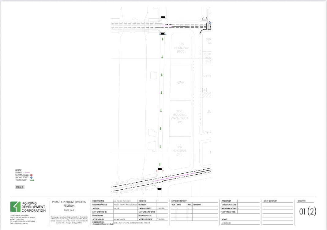 ހުޅުމާލޭ ފޭސް އެކަކާއި ފޭސް ދޭއް ގުޅުވައިދޭ ބްރިޖު 2 އަދި 3 އާ ދޭތެރޭ އޮންނަ ސަރަހައްދު (ކުރެދިމާ ހިނގުން) އަކީ އެއްކޮޅަށް ދުއްވޭ މަގަކަށް ބަދަލުކޮށްފިއެވެ.