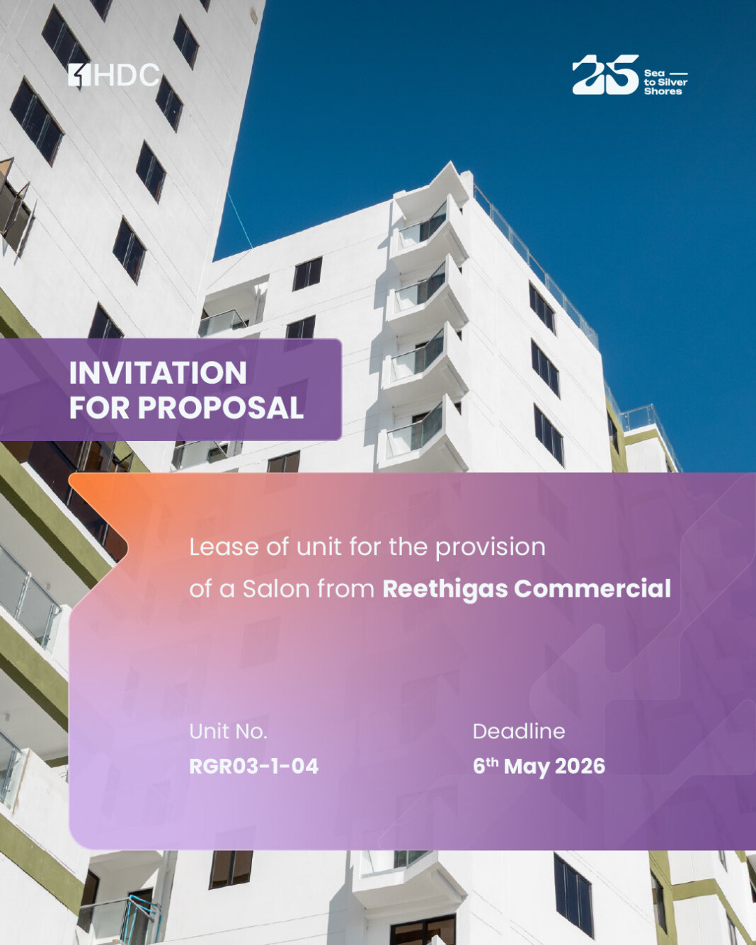 ހައުސިންގ ޑިވެލޮޕްމަންޓް ކޯޕަރޭޝަން (އެޗްޑީސީ) އިން ހުޅުމާލޭގެ ރީތިގަސް ކޮމާޝަލް އިމާރާތުން ސެލޫނެއް ހިންގުމަށް ޔުނިޓެއް ކުއްޔަށް ދޫކުރުމަށް ނިންމައި، އެކަމަށް ޝައުގުވެރިވާ ފަރާތްތަކަށް ޕްރޮޕޯސަލް ހުށަހެޅުމުގެ ފުރުސަތު މިއަދު ހުޅުވާލައިފިއެވެ.
