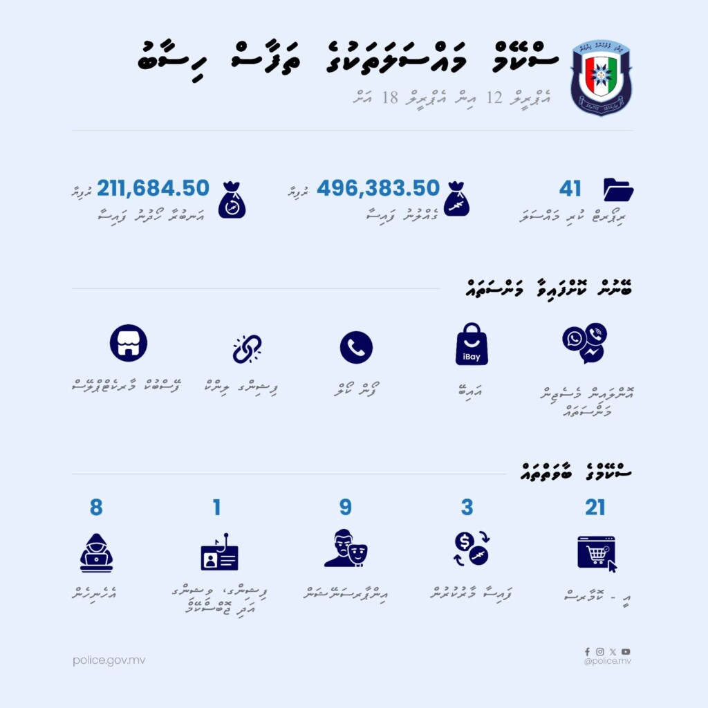 މި ހަފުތާގައި ޖުމުލަ ސްކޭމްގެ 41 މައްސަލަ ހުށަހެޅިފައިވާ އިރު، ޖުމުލަ ގެއްލުމުގެ އަދަދަކީ 496،383.50 ރުފިޔާއެވެ. އޭގެ ތެރެއިން 211،684.50 ރުފިޔާ ފުލުހުން ވަނީ ރިކަވާކޮށްފައެވެ. ހުށަހެޅުނު މައްސަލަތަކުގެ ތެރެއިން އެންމެ ގިނައީ އީ-ކޮމާސް ސްކޭމް މައްސަލަތަކެވެ. އެ ބާވަތުގެ 21 މައްސަލައެއް ހުށަހެޅިފައިވެއެވެ. އޭގެ އިތުރުން އިމްޕާސަނޭޝަން ނުވަތަ އެހެން މީހެއް ކަމަށް ހެދިގެން ހިންގި ސްކޭމްގެ 9 މައްސަލައަކާއި ކަރަންސީ އެކްސްޗޭންޖް ސްކޭމްގެ 3 މައްސަލައަކާއި ފިޝިން، ވިޝިން އަދި ވަޒީފާގެ ސްކޭމްގެ 1 މައްސަލައެއް ހިމެނެއެވެ. ބާކީ 8 މައްސަލައަކީ އެ ނޫން އެހެނިހެން ބާވަތުގެ ސްކޭމް މައްސަލަތަކެވެ.