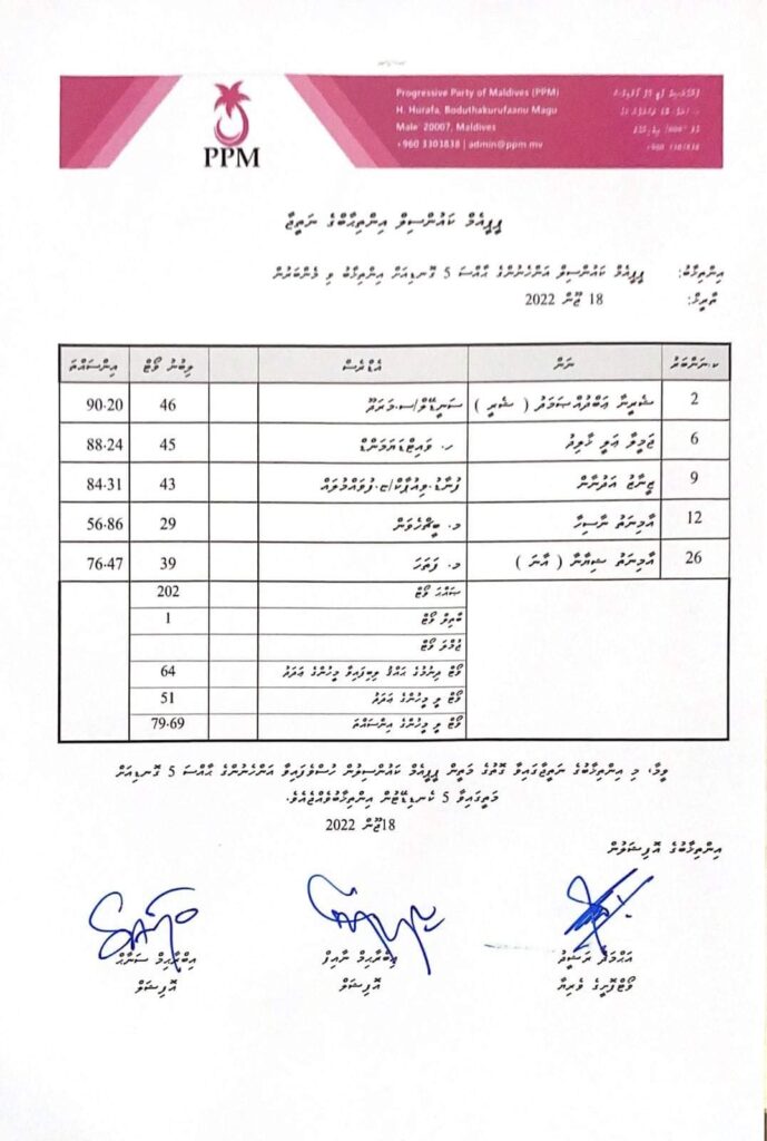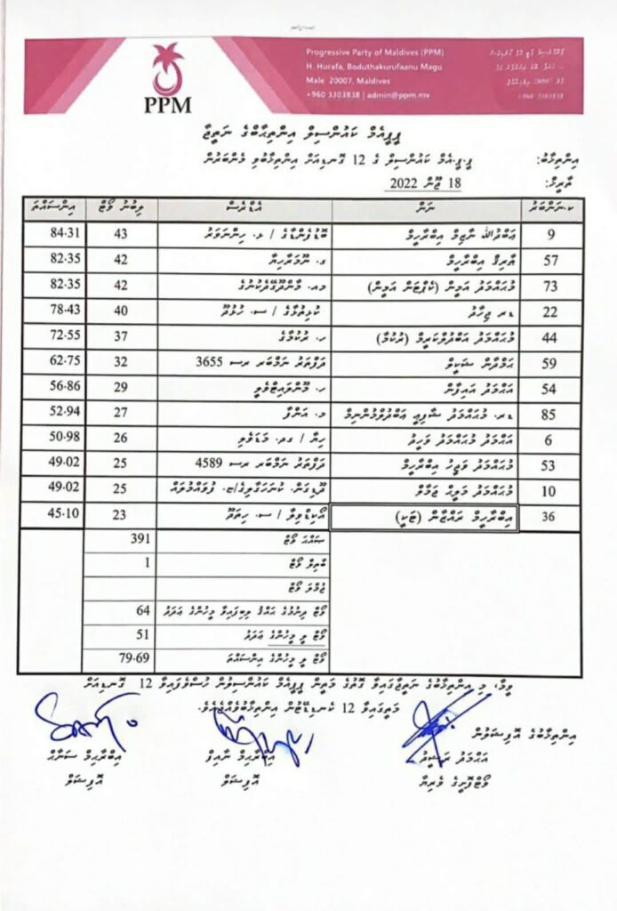 މި އިންތިހާބުގައި އެންމެ ގިނަ ވޯޓު ހޯއްދަވާފައިވަނީ ކުރީގެ ހެލްތް މިނިސްޓަރ މުހައްމަދު ނާޒިމްއެވެ. އޭނާއަށް 43 ވޯޓު ލިބުނު އިރު ދެވަނައަށް އެންމެ ގިނަ ވޯޓު ލިބުނީ ކުރީގެ އެންވަޔަރމަންޓް މިނިސްޓަރ ތާރިގު އަށެވެ. ތާރިގު އަށް 42 ވޯޓު ވަނީ ލިބިފައެވެ.