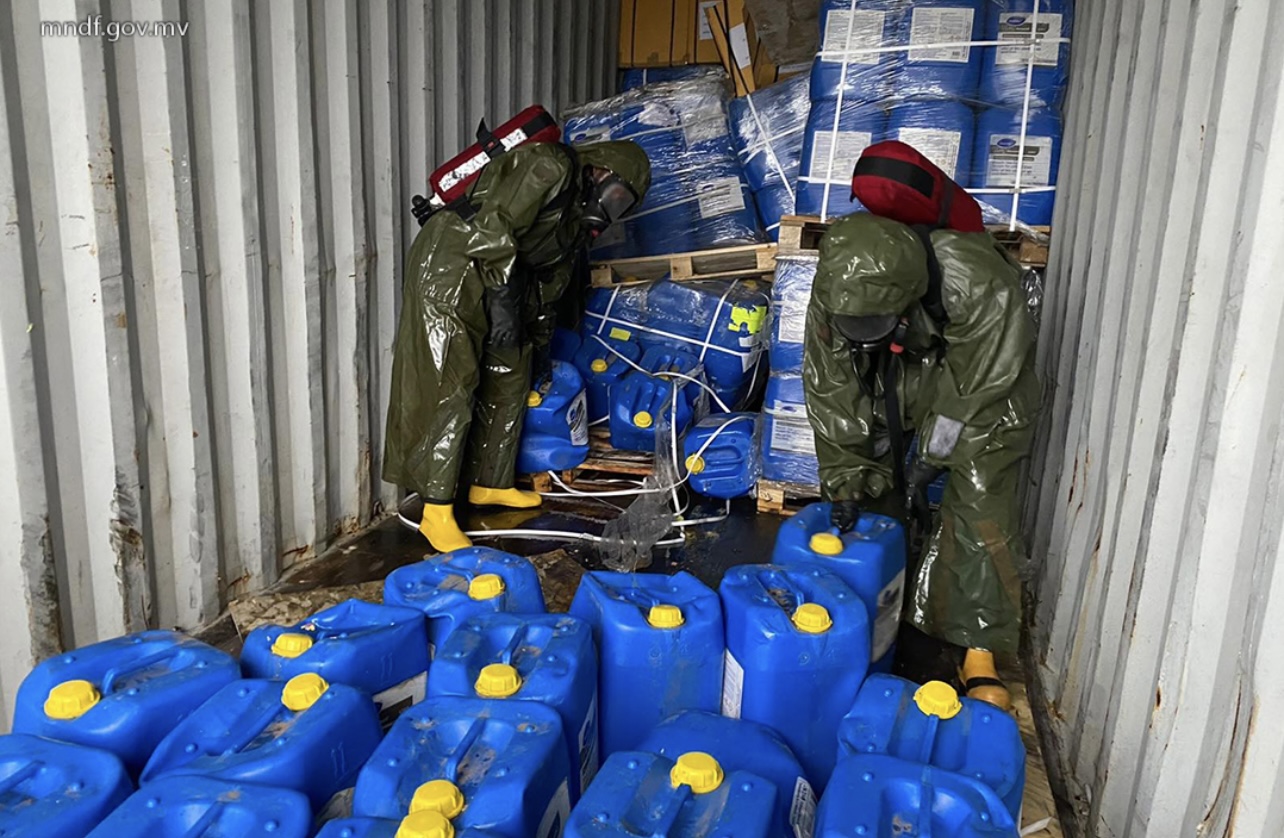 އެމްޕީއެލް ސަރަހައްދުގައި ހުރި ކެމިކަލް ކޮންޓޭނަރަކުން ކެމިކަލް ލީކުވަމުންދާތީ އެމްއެންޑީއެފް ފަޔަރ އެންޑް ރެސްކިޔު ސަރވިސްގެ ސިފައިން ހަރަކާތްތެރިވާން ފަށައިފިއެވެ.