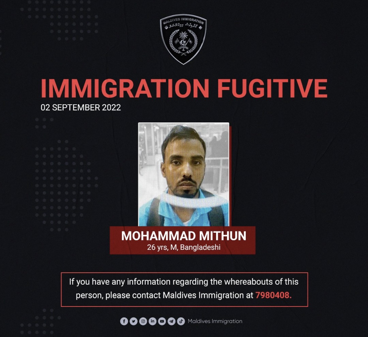 އެގޮތުން މޯލްޑިވްސް އިމިގްރޭޝަނުން ހޯދަން އިއުލާންކޮށްފައިވަނީ އުމުރުން 26 އަހަރުގެ ބަންގްލަދޭޝްގެ މުހައްމަދު މިތުން ކިޔާ މީހެކެވެ.
