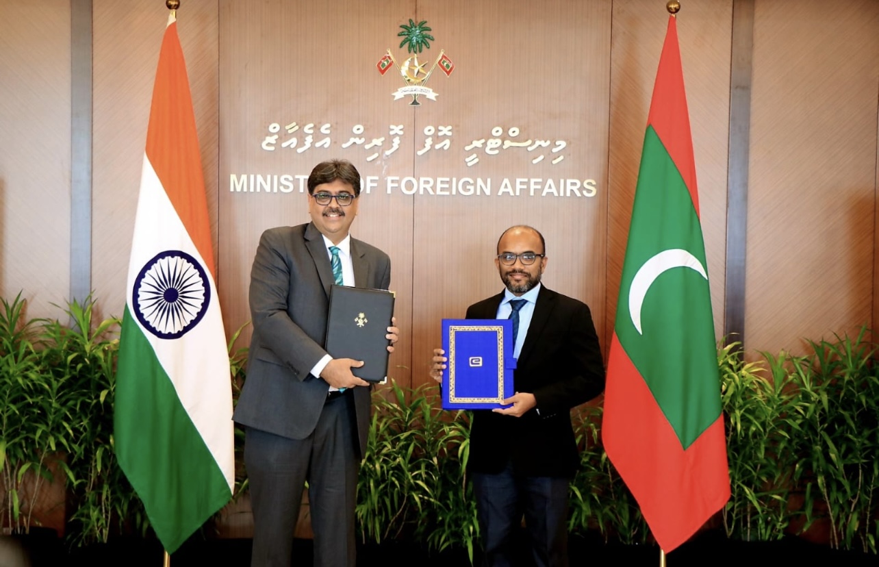 މިއަދު ފޮރިން މިނިސްޓްރީގައި ބޭއްވި ޚާއްސަ ރަސްމިއްޔާތެއްގައި އެއްބަސްވުމުގައި ރާއްޖޭގެ ފަރާތުން ސޮއިކުރެއްވީ ފިނޭންސް މިނިސްޓަރު އިބްރާހިމް އަމީރެވެ. އިންޑިއާގެ ފަރާތުން ސޮއިކުރެއްވީ އިންޑިއާގެ އެގްޒިމް ބޭންކްގެ ޖެނެރަލް މެނޭޖަރު ނިރުމިތު ވެދު އެވެ.
