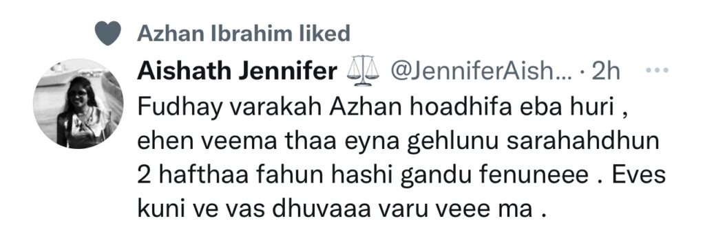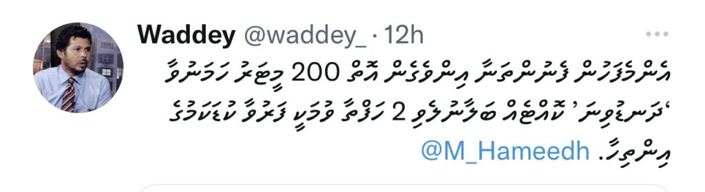 މިކަމާ ގުޅިގެން ކުރެއްވި ޓުވީޓެއްގައި މެންބަރު ވައްޑެ ވިދާޅުވީ، އެންމެފަހުން ފެނުންތަނާ އިންވެގެން އޮތް 200 މީޓަރު ހަމަނުވާ ‘ދަނޑުވިނަ’ ކޮއްޓެއް ބަލާނުލެވި 2 ހަފްތާ ވުމަކީ ފަރުވާ ކުޑަކަމުގެ އިންތިހާ ކަމަށެވެ.