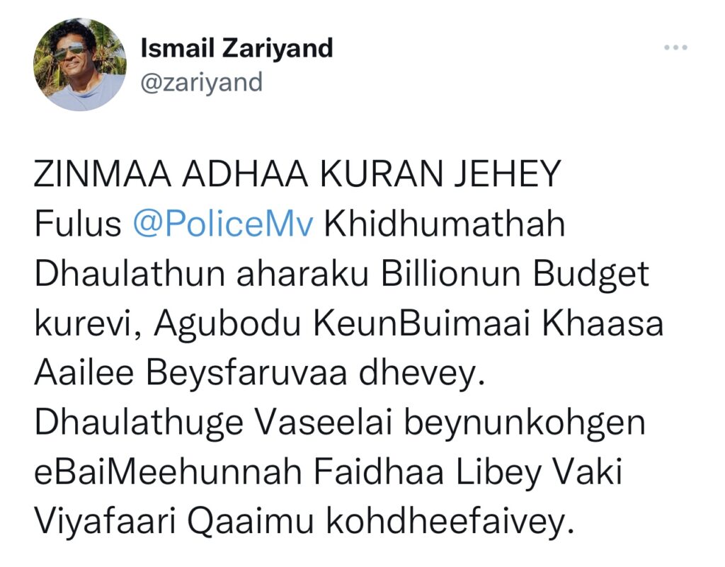 މީގެ އިތުރުންވެސް ކުރީގެ މަޝްހޫރު ފުޓްބޯލަ ކުޅުންތެރިޔާ ޒަރިޔަންދު ވިދާޅުވީ، ކޮންމެ އަހަރަކު ބިލިއަނުން ބަޖެޓް ދޭއިރު ފުލުހުން ޒިންމާ އަދާ ކުރަންޖެހޭ ކަމަށެވެ.