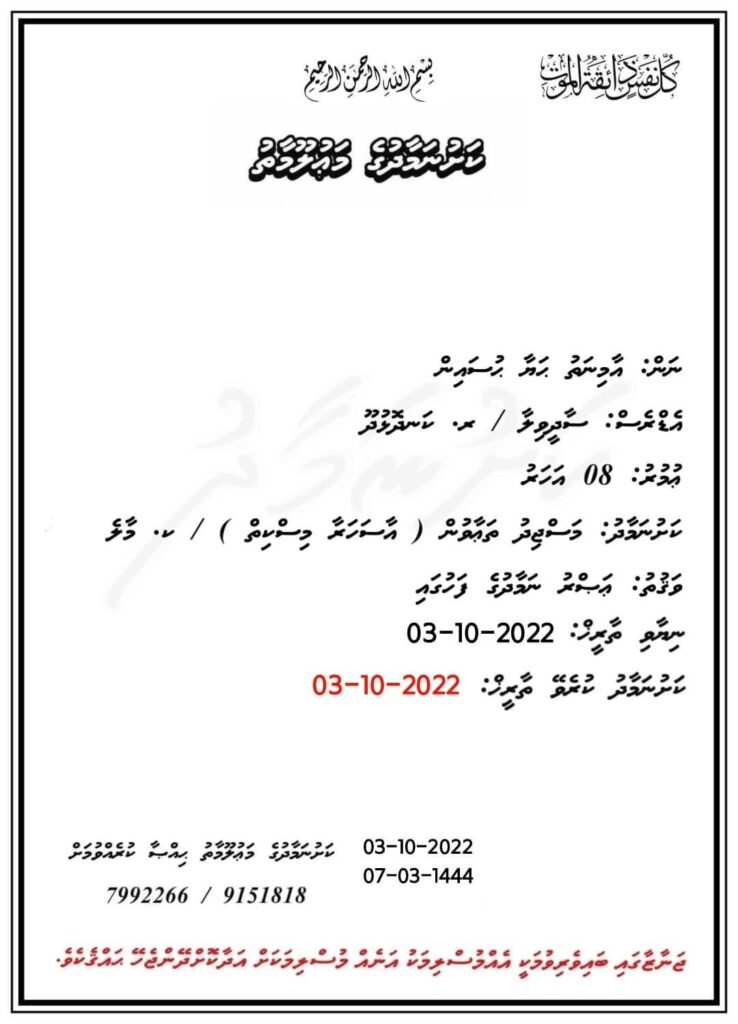 ޑެންގީހުން ޖެހިގެން މިއަދު ނިޔާވި 8 އަހަރުގެ ކުއްޖާގެ ކަށު ނަމާދު މިއަދި އަސުރު ނަމާދުގެ ފަހުގައި މަސްޖިދުއް ތައުވާން (އާސަހަރާ މިސްކިތުގައި) އޮންނާނެއެވެ.