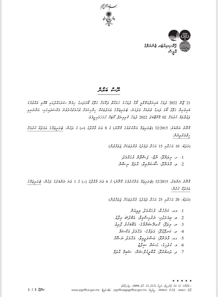 ޕީޖީ އޮފީހުން ބުނީ ޖޫން 21 ވަނަ ދުވަހު ބައިނަލް އަގުވާމީ ޔޯގާ ދުވަހުގެ ހަރަކާތާއި ދެކޮޅަށް ގަލޮޅު ބޯޅަ ދަނޑު ހިމެނޭ ސަރަހައްދުގައި ބޭއްވި އެއްވުމުގެ ބައިވެރިން ގަލޮޅު ބޯޅަ ދަނޑުގެ ތެރެއަށް ވަދެގަނެ، ޓެރަރިޒަމްގެ އަމަލުތަކެއް ހިންގި ކަމަށް ތުހުމަތު ކުރެވުނު މައްސަލާގައި ދައުވާތައް ކުރުމަށް ކުރިމިނަލް ކޯޓަށް ހުށަހަޅާފައިވާ ކަމަށެވެ.