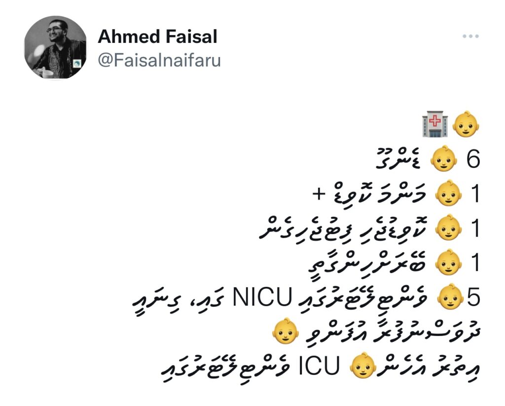 ޑރ ފައިސަލް ކުރެއްވި ޓުވީޓެއްގައި ވިދާޅުވީ، އެ ހޮސްޕިޓަލުގައި މިހާރުވެސް މަންމަ އަކާ ދަރިފުޅު ކޮވިޑަށް ޕޮޒިޓިވްވެގެންވެސް ފަރުވާ ދެމުންދާ ކަމަށެވެ. އަދި އެއް ކުއްޖަކު ކޮވިޑް ޖެހި ފިޓްޖެހިގެން ފަރުވާ ދެމުންދާއިރު އެއް ކުއްޖަކު ބޭރަށް ހިންގާތީވެސް އެޑްމިޓްކޮށްފައި އެބަ އޮތެވެ.