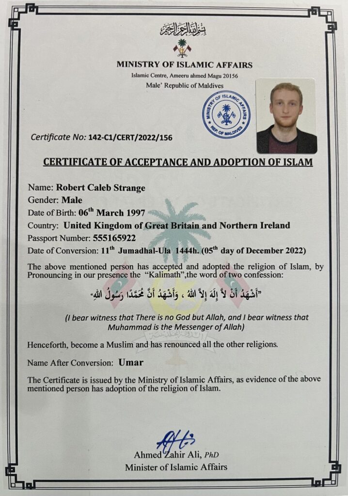 އިސްލާމިކް މިނިސްޓްރީންދީފައިވާ ސެޓްފިކެޓްގައިވާ ގޮތުން އުމަރު ވަނީ އިސްލާމް ދީން ގަބޫލުކޮށް، އިސްލާމްވުމުގެ ގޮތުން ޝަހާދަތް ކިޔާފައެވެ.