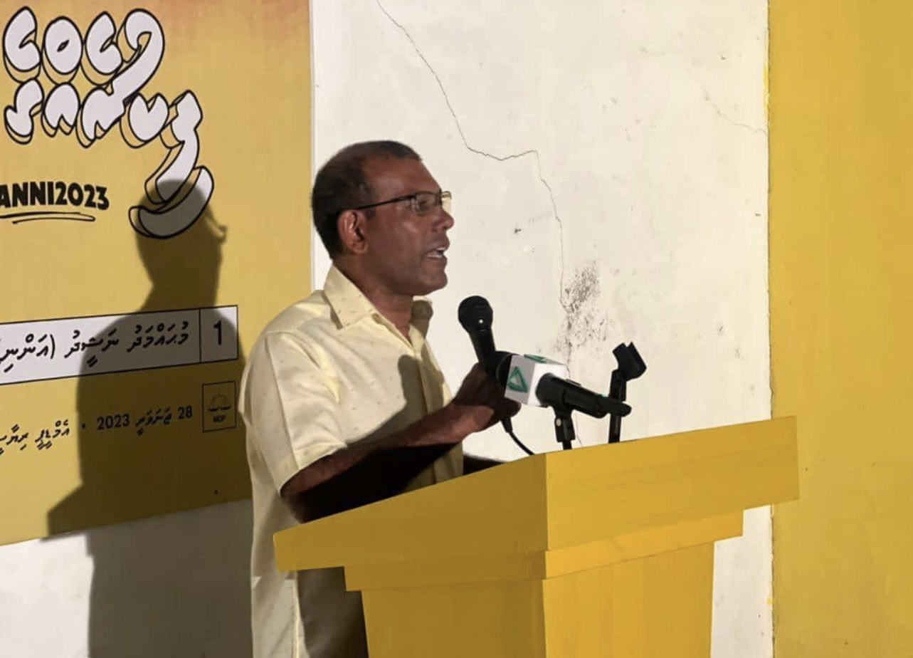 ރިޔަަސީ ޕްރައިމަރީގެ ކެމްޕެއިންގައި އައްޑޫ ސިޓީގެ މަރަދޫގައި އޮތް ބައްދަލުވުމެއްގައި ވާހަކަ ދައްކަވަމުން ނަޝީދު ވިދާޅުވީ ވޯޓު ގަންނަން އެމަނިކުފާނުގެ ވާދަވެރިން ފައިސާ ބަހާނެ ކަމަށެވެ.