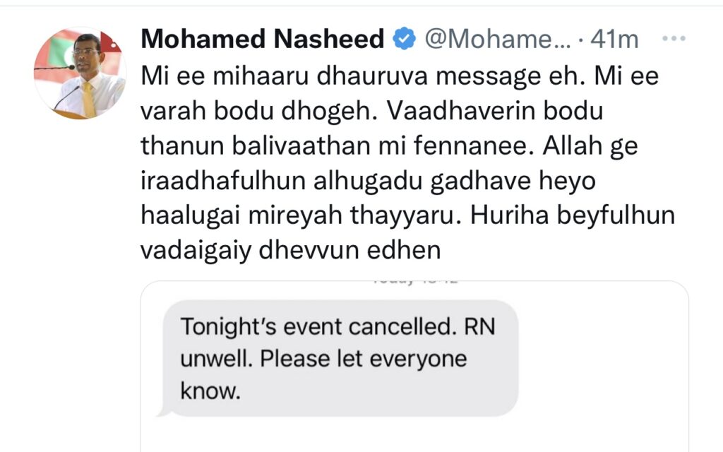 މިފަދަ މެސެޖްއަކާއެކު ނަޝީދު މިރޭ ކުރެއްވި ޓުވީޓެއްގައި ވިދާޅުވީ، މިއީ މިހާރު ދައުރުވާ މެސެޖެއް ކަމަށެވެ. އަދި މިއީ ވަރަށް ބޮޑު ދޮގެއް ކަމަށާއި ފެނިގެން މިދަނީ ވާދަވެރިން ބަލިވާތަން ކަމަށެވެ.