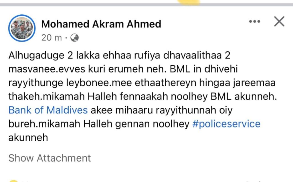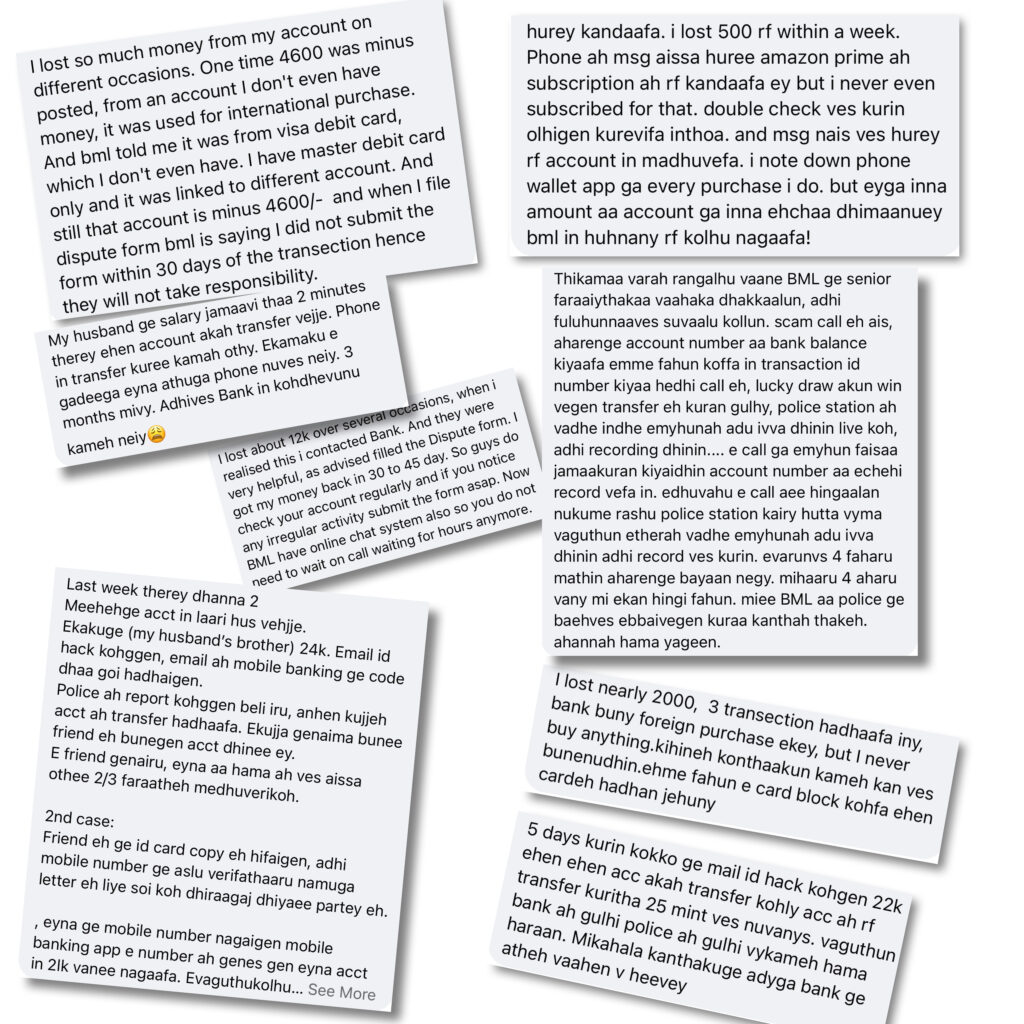 މިދިޔަ ހަފްތާ ތެރޭ އަހަރެން ދަންނަ ދެ މީހެއްގެ އެކައުންޓުން ލާރި ހުސްވެއްޖެ. އެކަކުގެ 24 ހާސް ރުފިޔާ. އީމެއިލް އައިޑީ ހެކް ކޮށްގެން އީމެއިލްއަށް މޮބައިލް ބޭންކިންގެ ކޯޑް ދާގޮތް ހަދައިގެން. ޕޮލިސް އަށް ރިޕޯޓްކުރީމަ ބުނީ އަންހެން ކުއްޖެއްގެ އެކައުންޓަށް ޓްރާންސްފަރ ހަދާފައޭ.އެކުއްޖާ ގެނައިމަ ބުނީ ރައްޓެއްސެއް ބުނެގެން އެކައުންޓް ނަމްބަރު ދިނީމޭ.