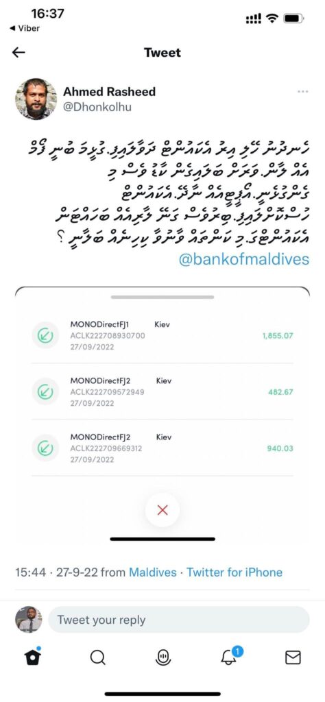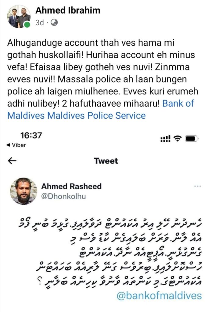 ‘ މީގެން އެއްވެސް މުއާމަލާތެއް ހިނގައިގެން ނުވަތަ އެކައުންޓުން ފައިސާ ގެއްލިގެން އެއަށްވީ ގޮތް ބުނުމުން ބެންކަކަށް އެއްކަމެއްވެސް ކޮށެއް ނުދެވޭ. އަހަރެން މިބުނަނީ ގުޅާފައި ބައްޕަ ހުރީ ލަންކާގައޭ. ކާރޑް އޮތީ ބައްޕަ އަތުގައޭ. އެކަމަކު މަޖީދީ މަގުގައި ހުރި ފިހާރައަކުން ވިޔަފާރިކޮށްގެން ފައިސާ ކަނޑާފި ކަމުގެ މެސެޖު އައިސްފިއޭ. ކިހިނެއްހޭ މިވަނީ. ބެންކަކަށް ޖަވާބެއް ނުދެވުނު.’
