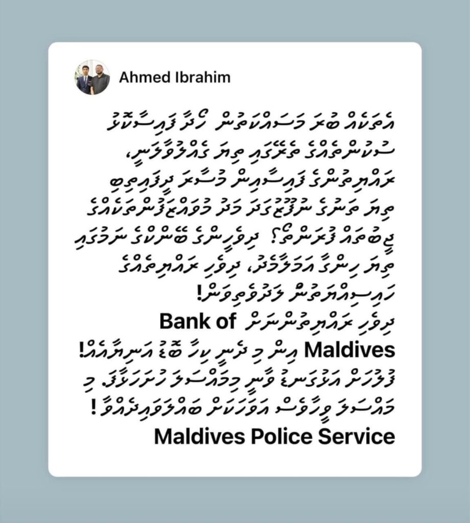 ‘ އަހަރެންގެ ފިރިމީހާގެ މުސާރަ ޖަމާވިތާ ދެ މިނެޓްތެރޭ އެހެން އެކައުންޓަކަށް ޓްރާންސްފަރ ކޮށްފި. ފޯން އިން ޓްރާންސްފަރ ކުރި ކަމަށް އޮތީ. އެކަމަކު އެވަގުތު އޭނަ އަތުގައި ފޯނު ނުވެސް ނެތް. ތިން މަސް މިވީ އަދިވެސް ބެންކަށް ކޮށްދެވުނު ކަމެއް ނެތް ‘.