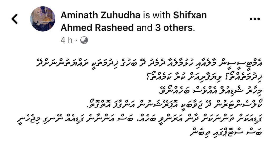 ‘ މިހާރު މިވާގޮތަކީ ބަސް ފުރުނީމަ ނައްޓާލަނިއްޔޯ. ވަކި ގަޑިއެއް ނޯވެޔޯ. މިދެން އަރަތެއްނު. ސްކޫލް ކުއްޖަކު ގޮވައިގެން ގަވައިދުން މާލެ ދާ މަންމަ އަކު ބުންޏެވެ.