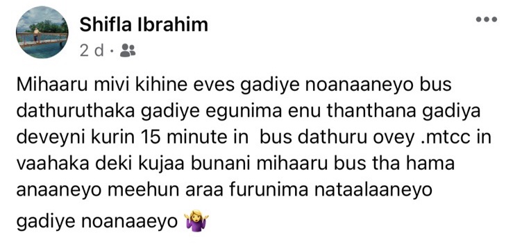 3. މިތަނަކީ ވަކި ބަސް ލޭނެއް އޮންނަ ތަނެއްނޫން ޝެޑިއުލެއްގައި މިކަން ކުރަން.. ސައިކަލު ދުއްވާހެންބަސް ދުއްވަމުން އާންމުންނާއި ޓެކްސީ ޑުރައިވަރުނގެ ދުއްޕާނާއެކު ވަރަށް ޙާލުގައި މިޙިދުމަތް ދޭތީވެސް ޝުކުރުވެރިވާން ޖެހޭ.. މިވަގުތު މިކަން ހުއްޓާލިޔަސް ކޮނޑަށް ދަރިން ލައިގެން ސުކޫލަށް އުފުލަންޖެހޭ ދުވަހު ޝުކުރުވެރިވާން ދަސްވާނެ..ހެނދުނު ސުކޫލަށް އަދި ނިމޭ ގަޑީގައި އެކްސްޓްރާ އިތުރު 5 ބަސް ނެރިގެން އެބަ ދުއްވާ..ދުނިޔޭގެ އެއްވެސް ތަނެއްގައި ކުރާކަމެއްނޫން ޓެކްސީ ދުއްވާހެން ބަސް ދުއްވުން.. އެކަމު ރައްޔިތުންނަށްޓަކައި އެކަންވެސް އެބަ ކޮއްދޭ..ކުރަންޖެހޭ ކަމެއްނޫން..ހަމަ ޝެޑިއުލް އެކަނި ހިންގަންވީ އެޕްރިޝިއޭޓް ނުކުރާ ބައެއްކާރީ..ގަޑިޖެހެންވީމަ ނިކުމެގެން ގަޑިއަށް ބަހުގައި ނުދެވޭނެ..ބަސް ދުއްވެނީ ރަށުތެރޭ 30އަށް ބުރިޖުގައި 50 އަށް.. އެއަށްވުރެބާރަށް ދުއްވިއްޔާ ޑުރައިވަރުގެ ވަޒީފާ ގެއްލޭ..މީހަކު އިސްތައްޓޭ ބުނާއިރަށް ހަބަރެއް ލިޔުނަކަސް ނުވާނެ..