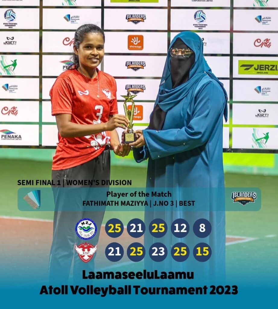 އެގޮތުން މި މުބާރާތުގެ ފައިނަލަށް ބެސްޓް ގޮސްފައިވަނީ ސެމީ ފައިނަލުގެ ފުރަތަމަ މެޗްގައި މުންޑޫ ޒުވާނުންގެ ޖަމިއްޔާ ބަލި ކުރުމަށްފަހުއެވެ. ފޯރިގަދަ ފަސް ސެޓް ފެނިގެންދިޔަ މި މެޗްގެ ފުރަތަމަ ސެޓް ގެންދިޔައީ 25-21 އިން މުންޑޫ ޒުވާނުންގެ ޖަމިއްޔާއެވެ. އެއަށްފަހު ދެވަނަ ސެޓް 25-21 އިން ކާމިޔާބު ކުރީ ބެސްޓް ޓީމުންނެވެ. އަނެއްކާވެސް ތިންވަނަ ސެޓް މުންޑޫ ޒުވާނުންގެ ޖަމިއްޔާ އިން ގެންދިޔައީ 25-23 އިންނެވެ. އޭގެ ފަހުން ހަތަރު ވަނަ ސެޓް 25-12 ބެސްޓް ޓީމުން ހޯދިއެވެ.