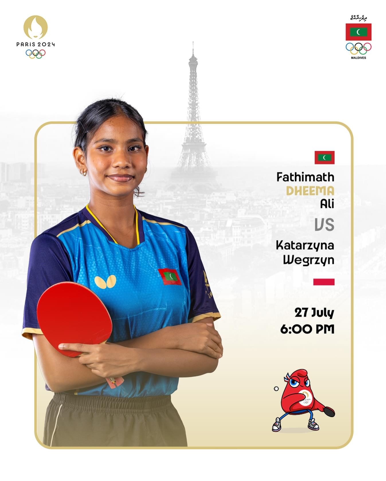 އޮލިމްޕިކްސްގައި ރާއްޖޭގެ ޓޭބަލް ޓެނިސްގެ ތަރި ފާތިމަތު ދީމާ އަލީ ކުޅުނު ފުރަތަމަ މެޗުގައި ޕޮލެންޑްގެ ކުޅުންތެރިޔާ ވެގްޒީން ކަޓާޒީނާ އަތުން ފަސޭހައިން ބަލިވެއްޖެ އެވެ.