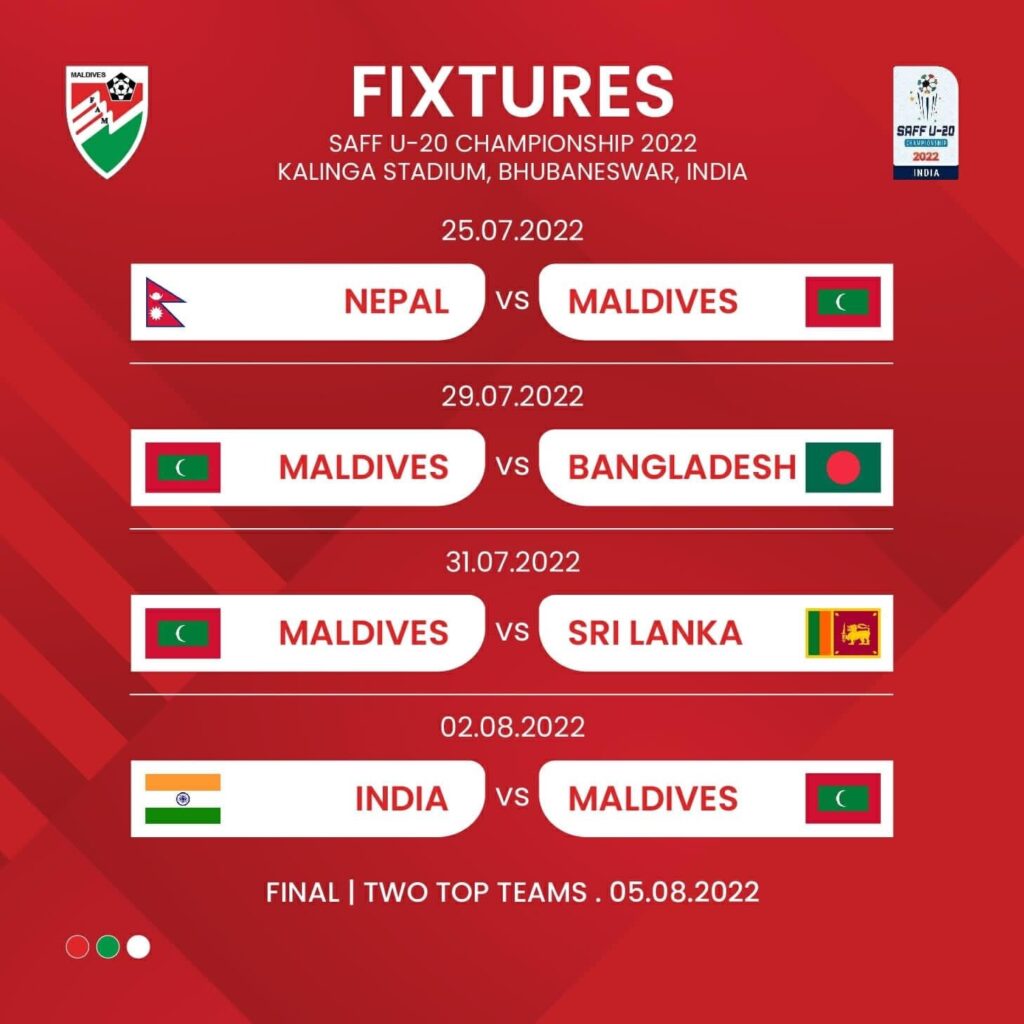 މުބާރާތުގެ ފުރަތަމަ މެޗްގައި ބައްދަލު ކުރަނީ ރާއްޖެ އަދި ނޭޕާލެވެ. ދެވަނަ މެޗް މިމަހުގެ 29 ވަނަ ދުވަހު ކުޅޭއިރު ބައްދަލު ކުރުމަށް ތާވަލުކޮށްފައިވަނީ ރާއްޖެ އަދި ބަންގްލަދޭޝްއެވެ.