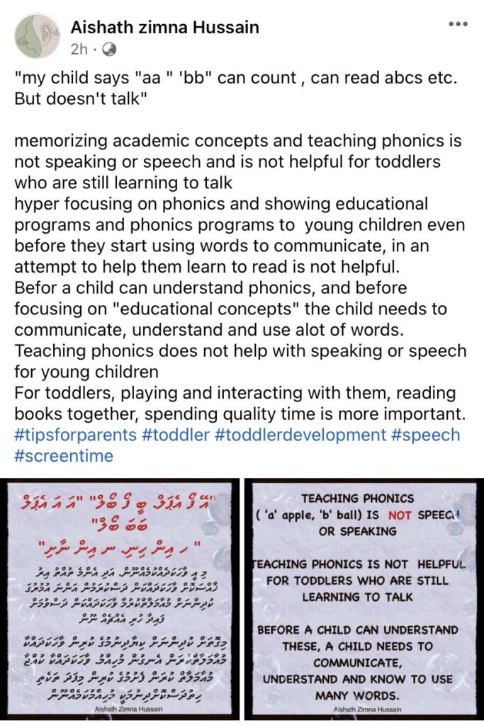 ރާއްޖޭގެ ސްޕީޗް ޕެތޮލޮޖިސްޓެއްކަމަށްވާ އައިޝަތު ޒިމްނާ ހުސެއިންގެ ފޭސްބުކްގައި ވަނީ މިކަމާއި ގުޅުންހުރި ބައެއް މައުލޫމާތު ހިއްސާކޮށްފަ އެވެ. އެގޮތުން “އޭ ފޯ އެޕަލް، ބީ ފޯ ބޯލް” އަދި “ހ އިން ހިނި، ނ އިން ނާށި” ކިޔުމަކީ ވާހަކަދެއްކުން ނޫންކަމަށް ޒިމްނާވަނީ ވިދާޅުވެފަ އެވެ.